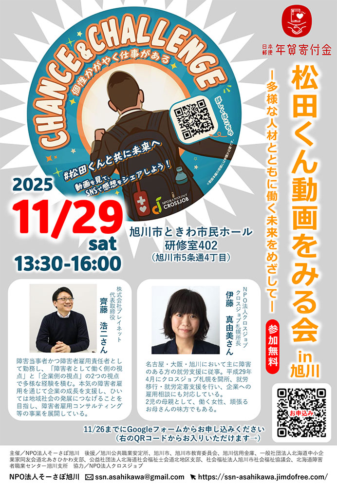 『NPO法人そーさぽ旭川』様が主催する「松田くん動画を見る会㏌旭川」に参加します!